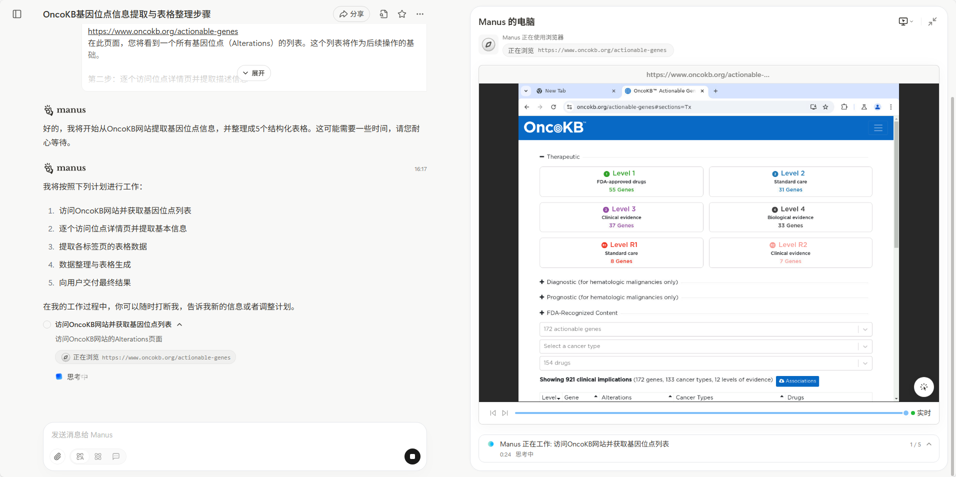 本次试用,我会让Manus对OncoKB进行爬取并整理信息。